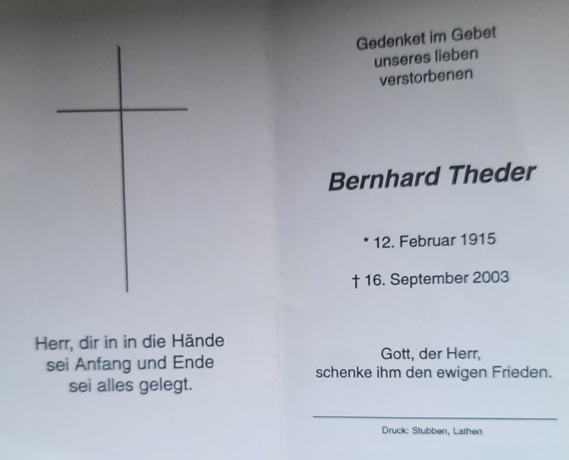 Wilt u bij het overnemen van gegevens uit deze stamboom alstublieft een verwijzing naar de herkomst opnemen: Pauline Berens BC, "Bevolkingsreconstructie Barger-Compascuum + Gezin + Rechtstreekse Voorouders + Nakomelingen", database, Genealogie Online (https://www.genealogieonline.nl/ofb-barger-compascuum/I14449.php : benaderd 12 januari 2026), "Bernhard Theder (1915-2003)".