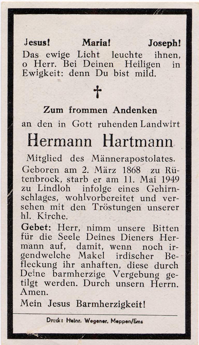 Bernd Hartmann: War Baecker in Ruetenbrock (Muehle Schoo). Musste nach dem Ausscheiden seines Bruders Johann Heinrich (wegen Heirat mit Magd Anna Helena Kramer) den Hof in Lindloh uebernehmen.