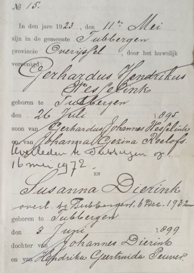 Zij zijn getrouwd op 11 mei 1923 te Tubbergen, Gemeente Tubbergen, Overijssel, Nederland, hij was toen 27 jaar oud.Bron 3