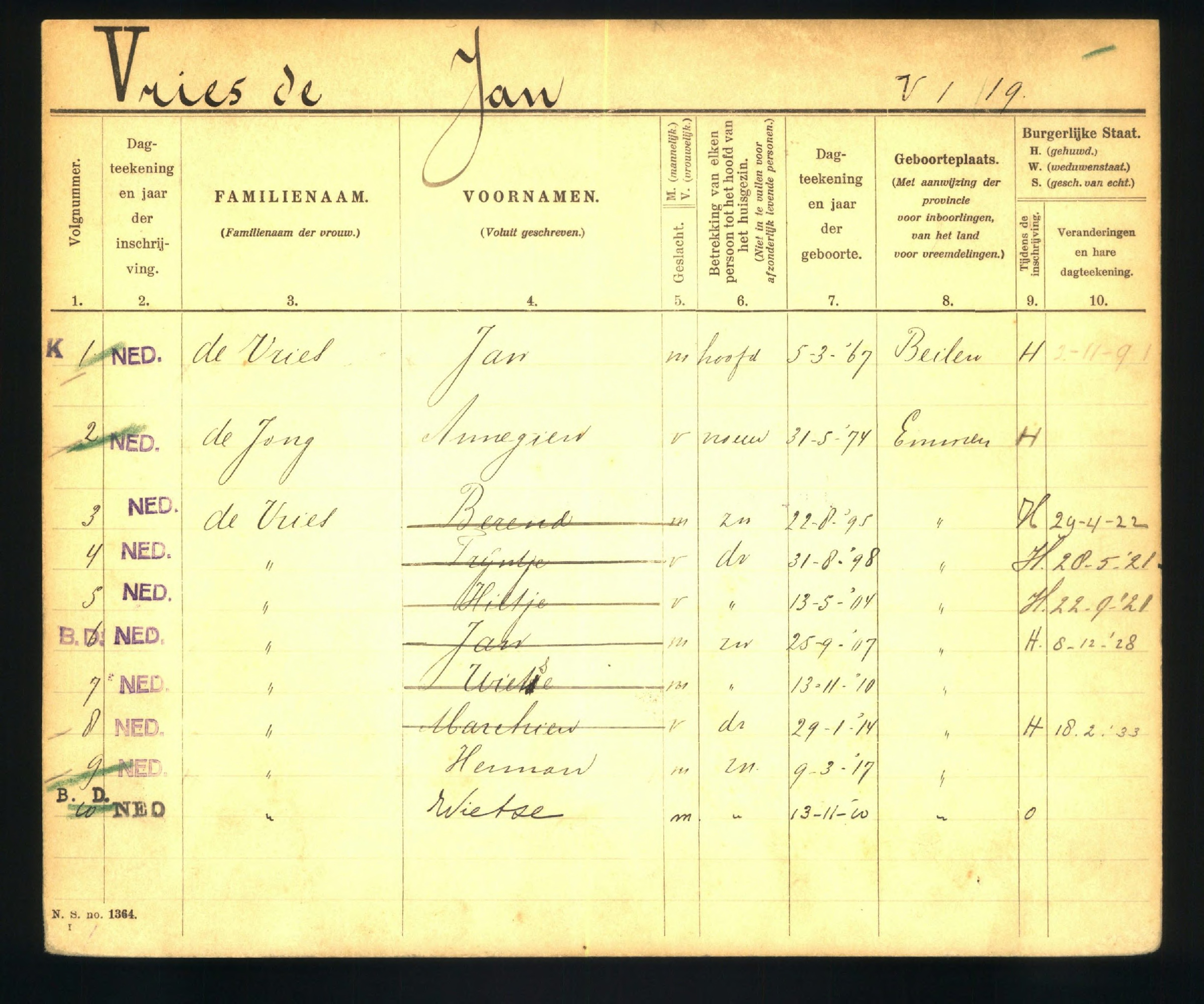 gezinskaart de Vries-de Jong 18573 p18573 1918-1936Huwelijk, Emmen, 03-11-1891, aktenummer 106