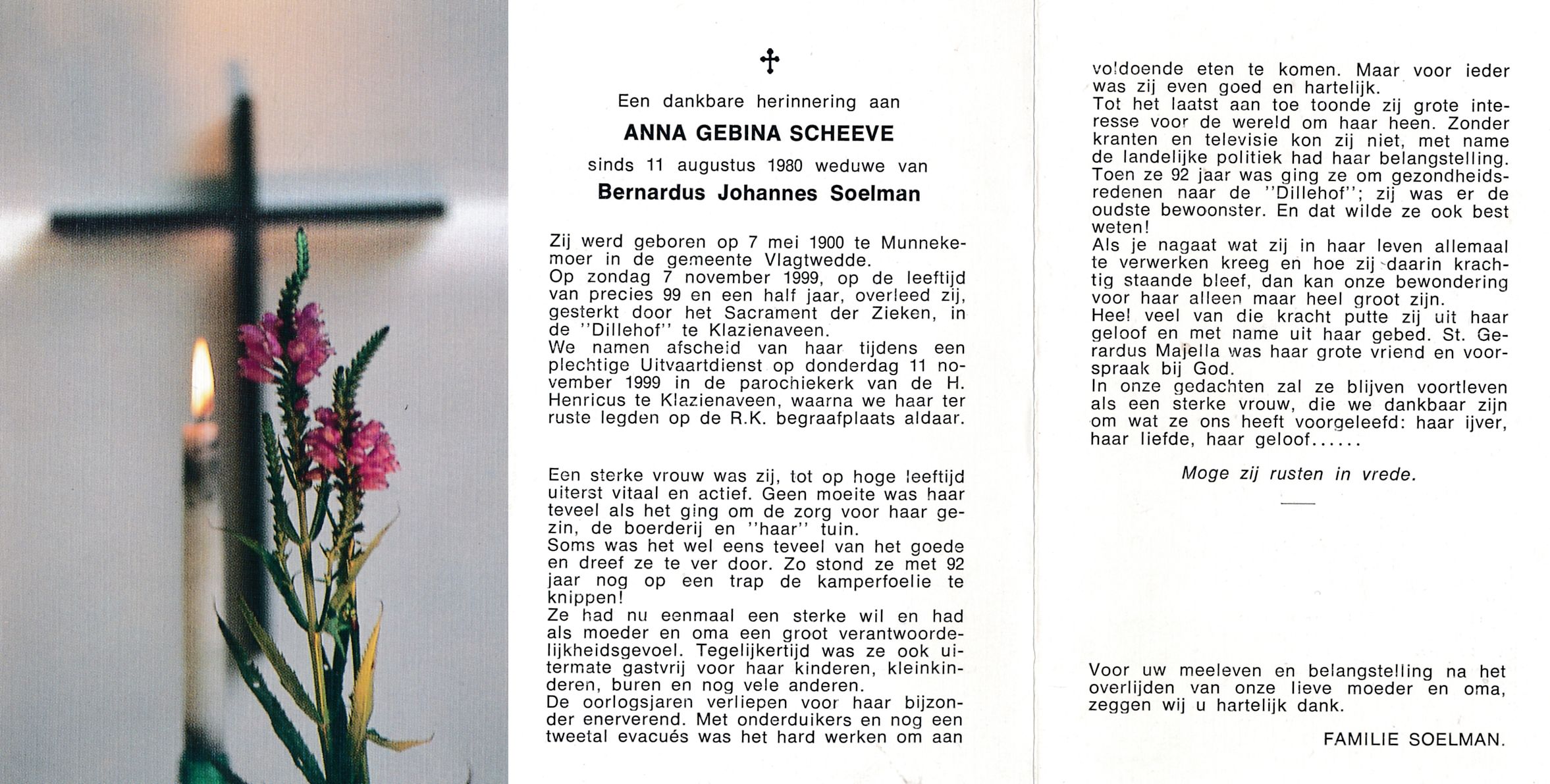 Kind: Anna Gebina Scheeve, geboren te Munsterscheveld (Emmen) op 07-05-1900, dochter van Johannes Scheeve, beroep: arbeider; oud: 29 jaar, en Theresia Truka Lange, beroep: zonder.