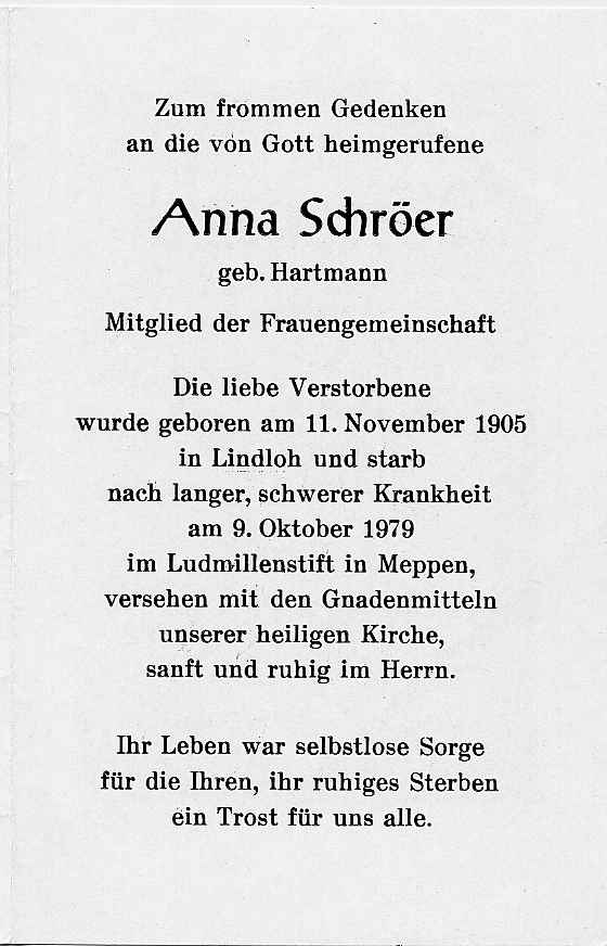 Schroer-Hartmann Anna (1905-1979) bidprentje
