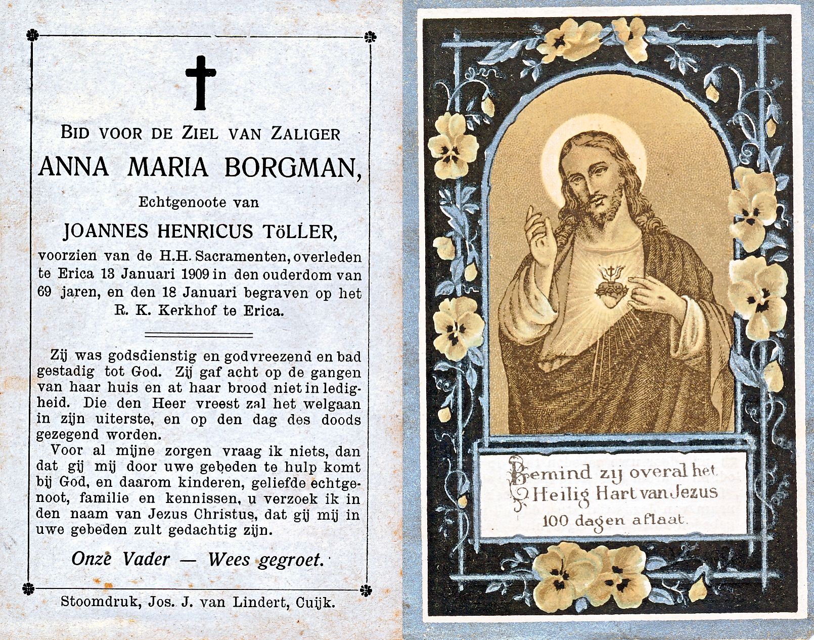 Overleden: Anna Maria Borgmann; geboren te Gross Füllen (Duitsland); beroep: zonder, overleden op 13-01-1909 te Emmen; oud: 69 jaar, dochter van NN NN en NN NN .