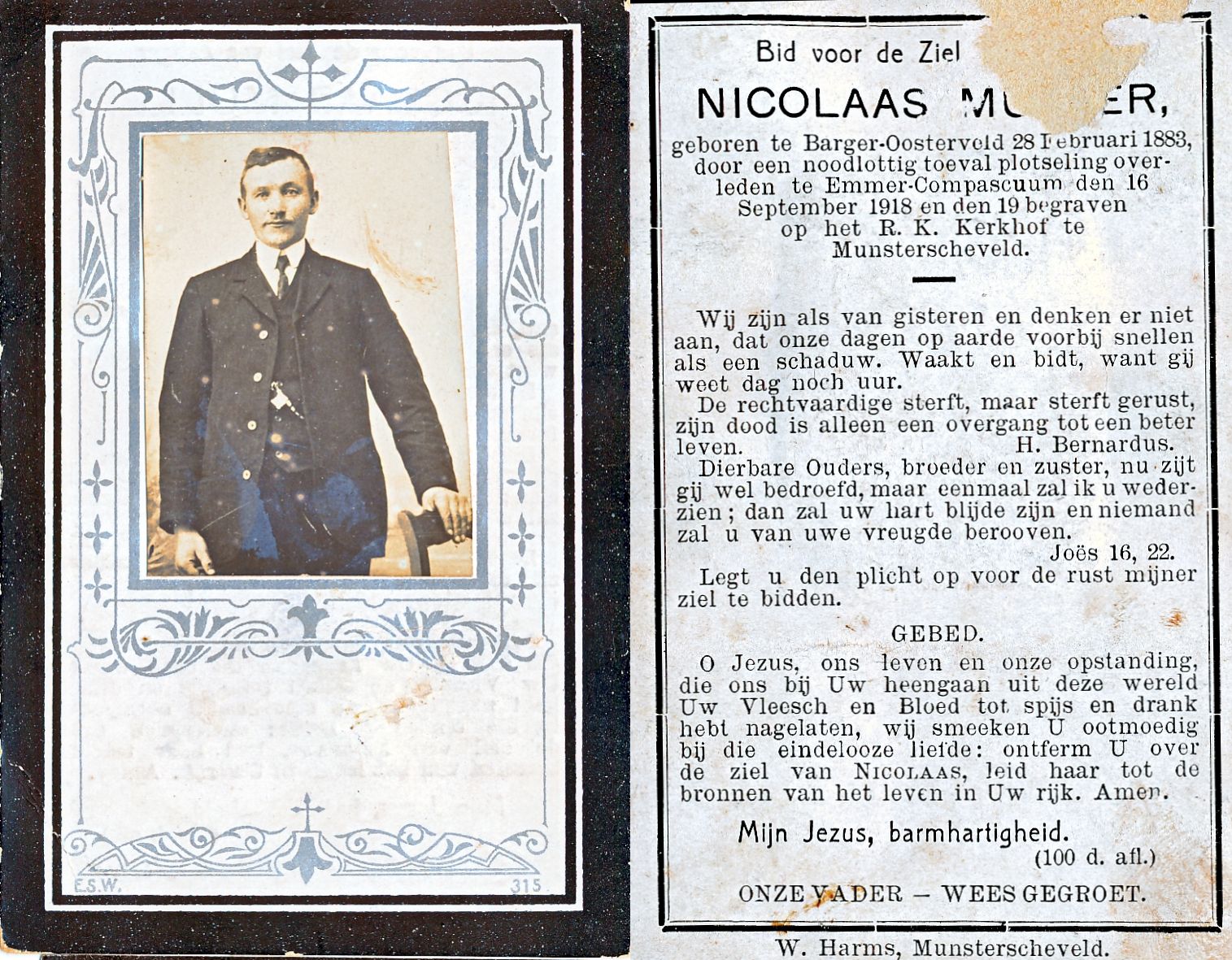 Wilt u bij het overnemen van gegevens uit deze stamboom alstublieft een verwijzing naar de herkomst opnemen: Pauline Berens BC, "Bevolkingsreconstructie Barger-Compascuum + Gezin + Rechtstreekse Voorouders + Nakomelingen", database, Genealogie Online (https://www.genealogieonline.nl/ofb-barger-compascuum/I4030.php : benaderd 24 december 2025), "Nicolaas - Klaas Muller (1883-1918)".