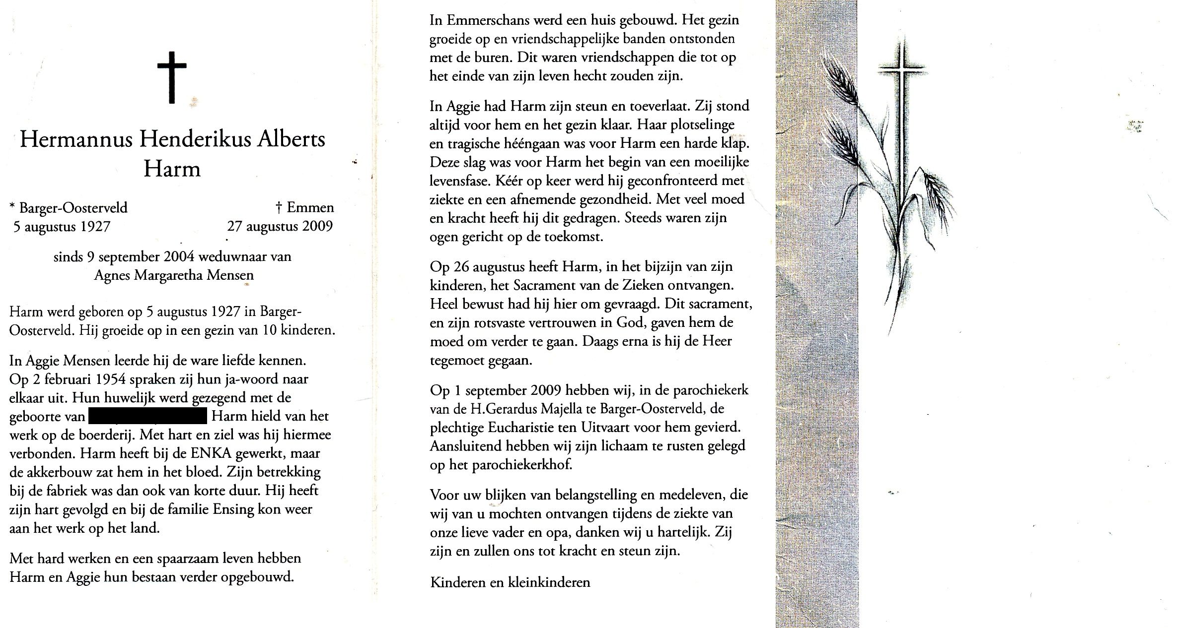 Wilt u bij het overnemen van gegevens uit deze stamboom alstublieft een verwijzing naar de herkomst opnemen: Pauline Berens BC, "Bevolkingsreconstructie Barger-Compascuum + Gezin + Rechtstreekse Voorouders + Nakomelingen", database, Genealogie Online (https://www.genealogieonline.nl/ofb-barger-compascuum/I57211.php : benaderd 30 december 2025), "Hermannus Henderikus - Harm Alberts (1927-2009)".