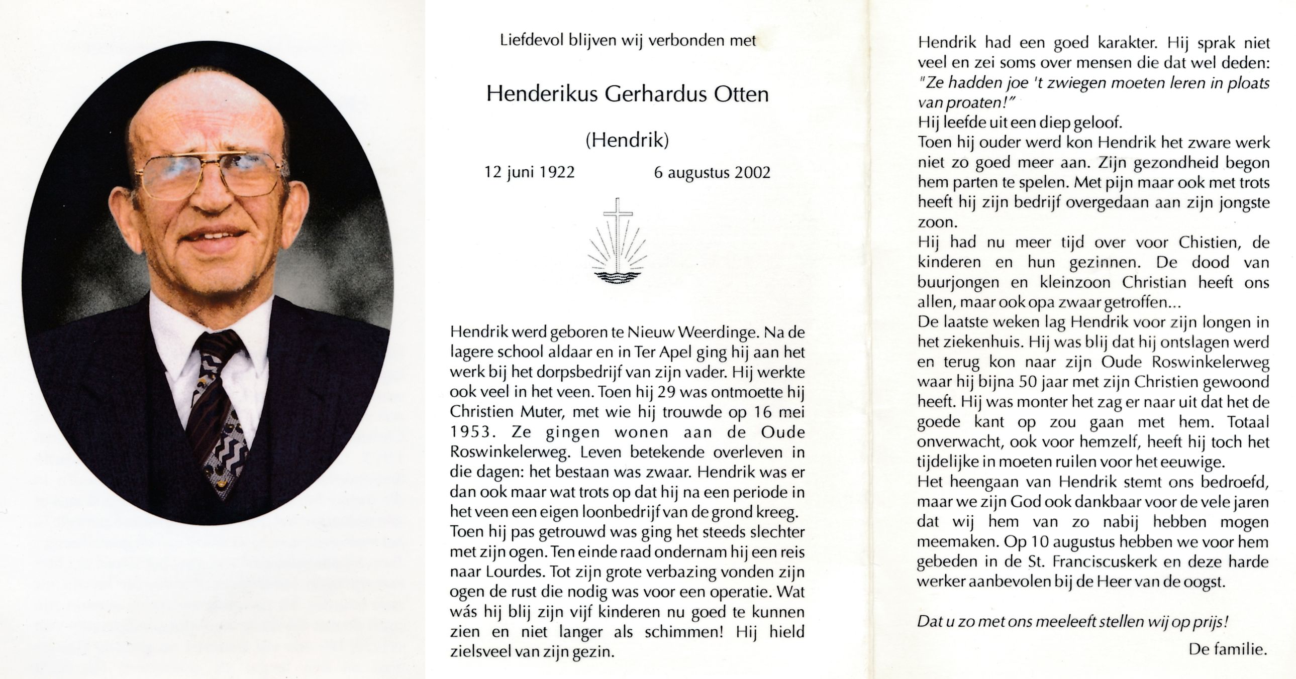 Wilt u bij het overnemen van gegevens uit deze stamboom alstublieft een verwijzing naar de herkomst opnemen: Pauline Berens BC, "Bevolkingsreconstructie Barger-Compascuum + Gezin + Rechtstreekse Voorouders + Nakomelingen", database, Genealogie Online (https://www.genealogieonline.nl/ofb-barger-compascuum/I57843.php : benaderd 24 december 2025), "Hendrikus Gerardus - Hendrik Otten (1922-2002)".