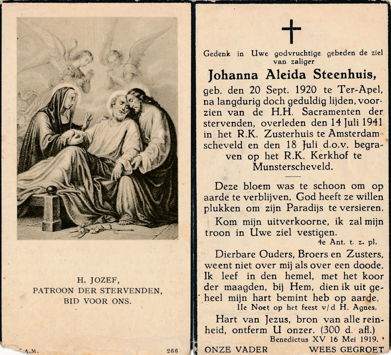 Wilt u bij het overnemen van gegevens uit deze stamboom alstublieft een verwijzing naar de herkomst opnemen: Pauline Berens BC, "Bevolkingsreconstructie Barger-Compascuum + Gezin + Rechtstreekse Voorouders + Nakomelingen", database, Genealogie Online (https://www.genealogieonline.nl/ofb-barger-compascuum/I58517.php : benaderd 30 december 2025), "Johanna Aleida Steenhuis (1920-1941)".
