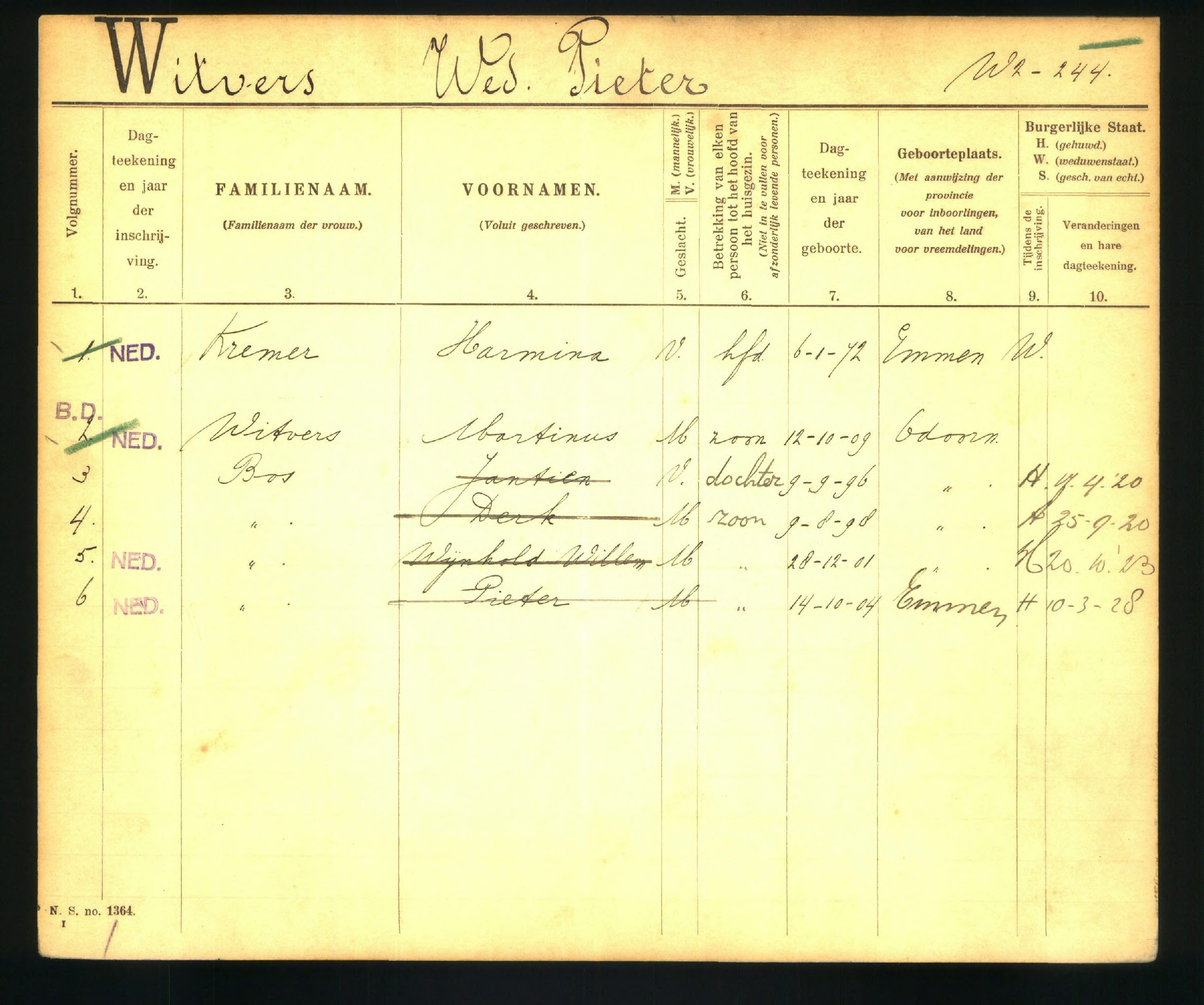gezinskaart Witvers-Kremer 19853 p19853 1918-1936Opmerkingen: weduwnaar Stijntje van Klinken; weduwe Andries Bos; vader bruidegom overleden; moeder bruidegom overleden