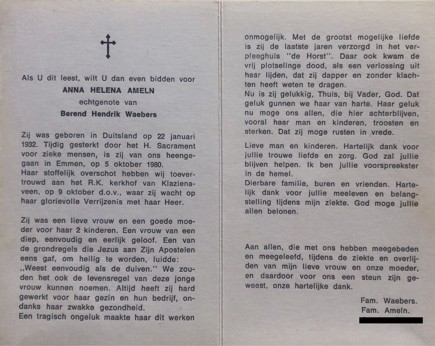 Wilt u bij het overnemen van gegevens uit deze stamboom alstublieft een verwijzing naar de herkomst opnemen: Pauline Berens BC, "Bevolkingsreconstructie Barger-Compascuum + Gezin + Rechtstreekse Voorouders + Nakomelingen", database, Genealogie Online (https://www.genealogieonline.nl/ofb-barger-compascuum/I64152.php : benaderd 29 december 2025), "Anna Helena Ameln (1932-1980)".