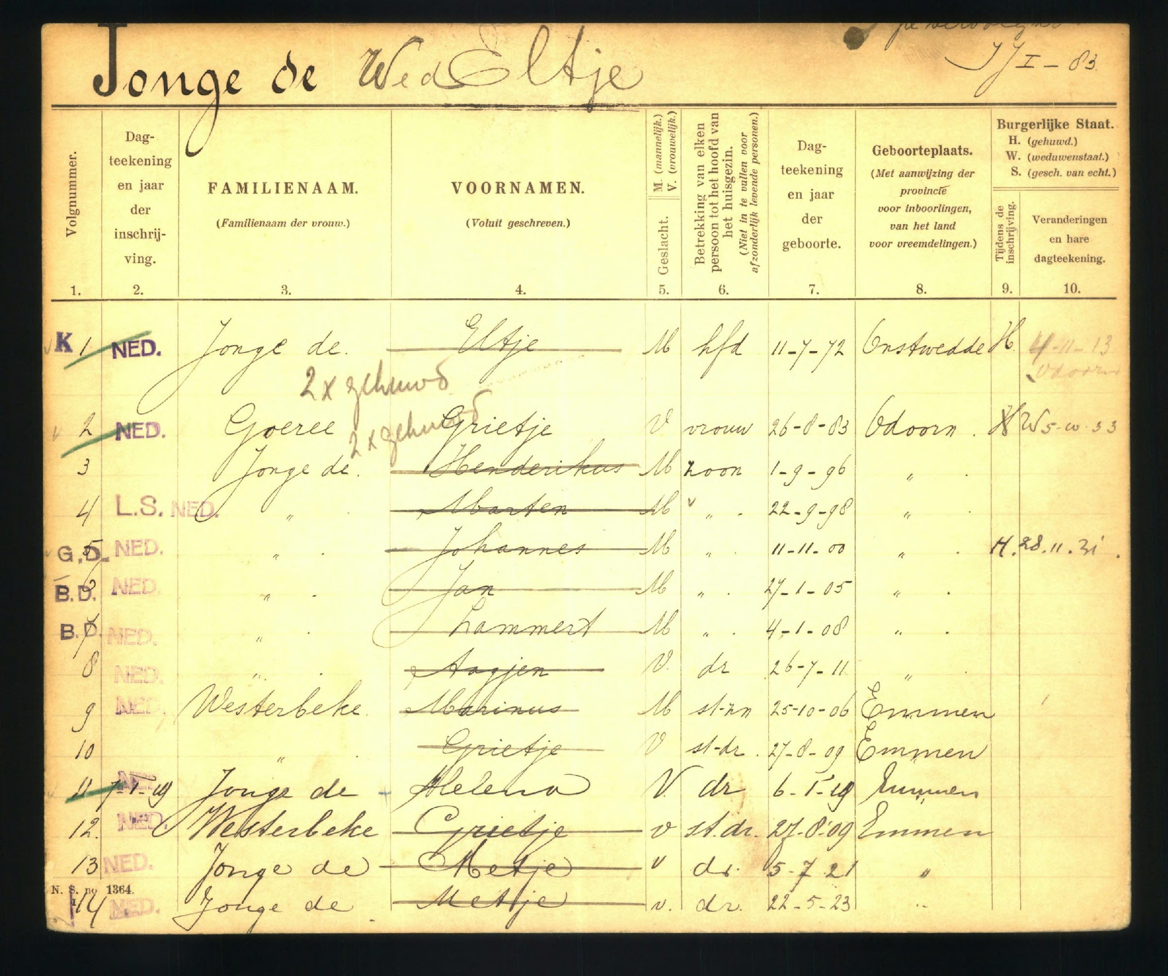 gezinskaart de Jonge-Goeree 08091 p8091 1918-1936Opmerkingen: weduwnaar Johanna Sanders; weduwe Jan Westerbeke; moeder bruidegom overleden