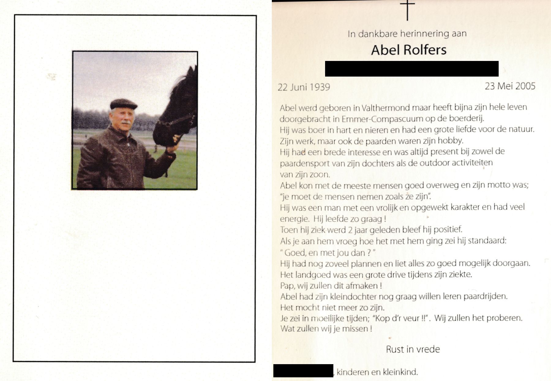 Wilt u bij het overnemen van gegevens uit deze stamboom alstublieft een verwijzing naar de herkomst opnemen: Pauline Berens BC, "Bevolkingsreconstructie Barger-Compascuum + Gezin + Rechtstreekse Voorouders + Nakomelingen", database, Genealogie Online (https://www.genealogieonline.nl/ofb-barger-compascuum/I6931.php : benaderd 28 december 2025), "Abel Rolfers (1939-2005)".
