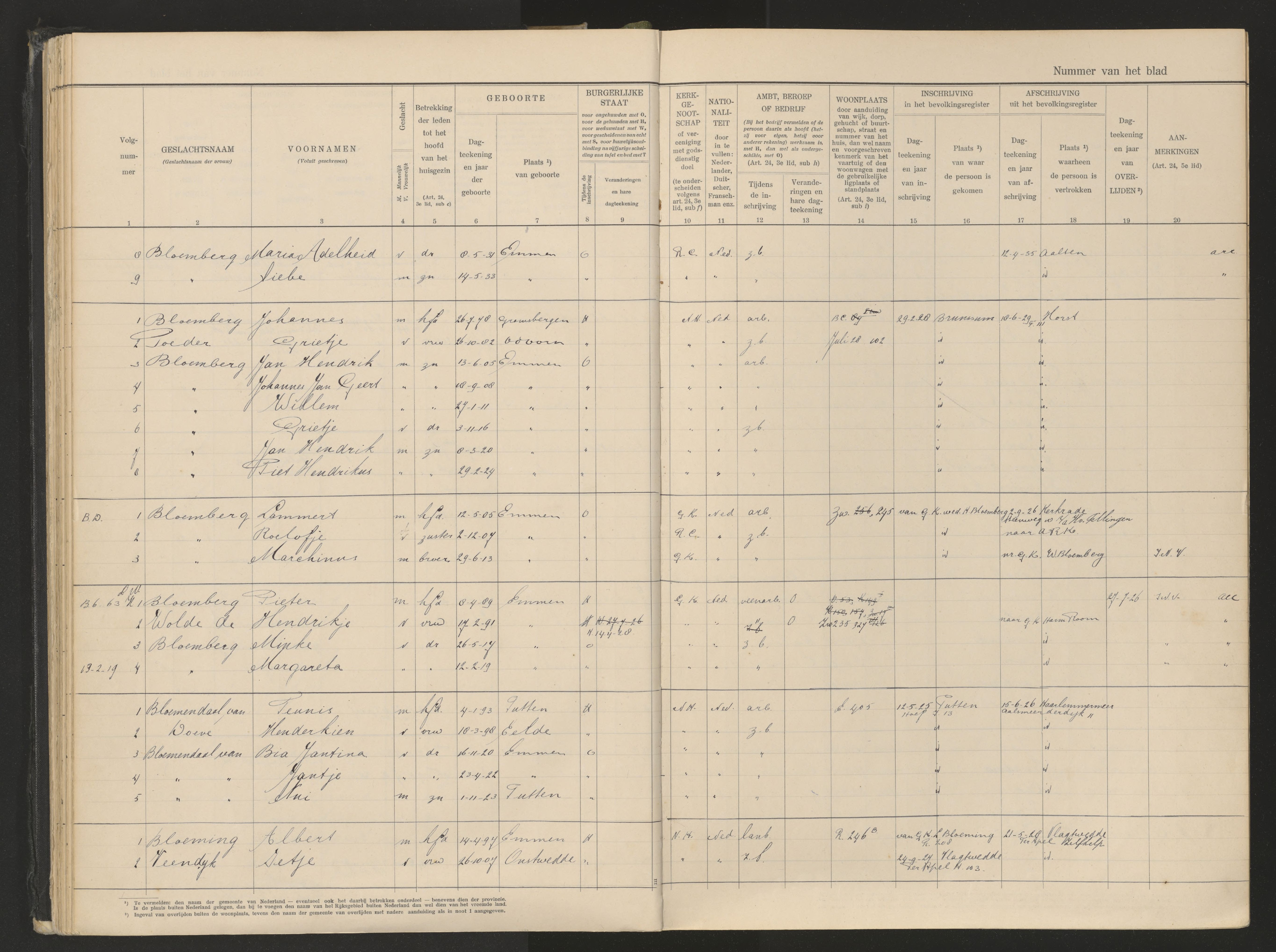 Vertrokken personen Emmen 1926-1936 Bloemberg-Poeder https://www.wiewaswie.nl/nl/detail/14676592Opmerkingen: vader bruidegom overleden; vader bruid overleden