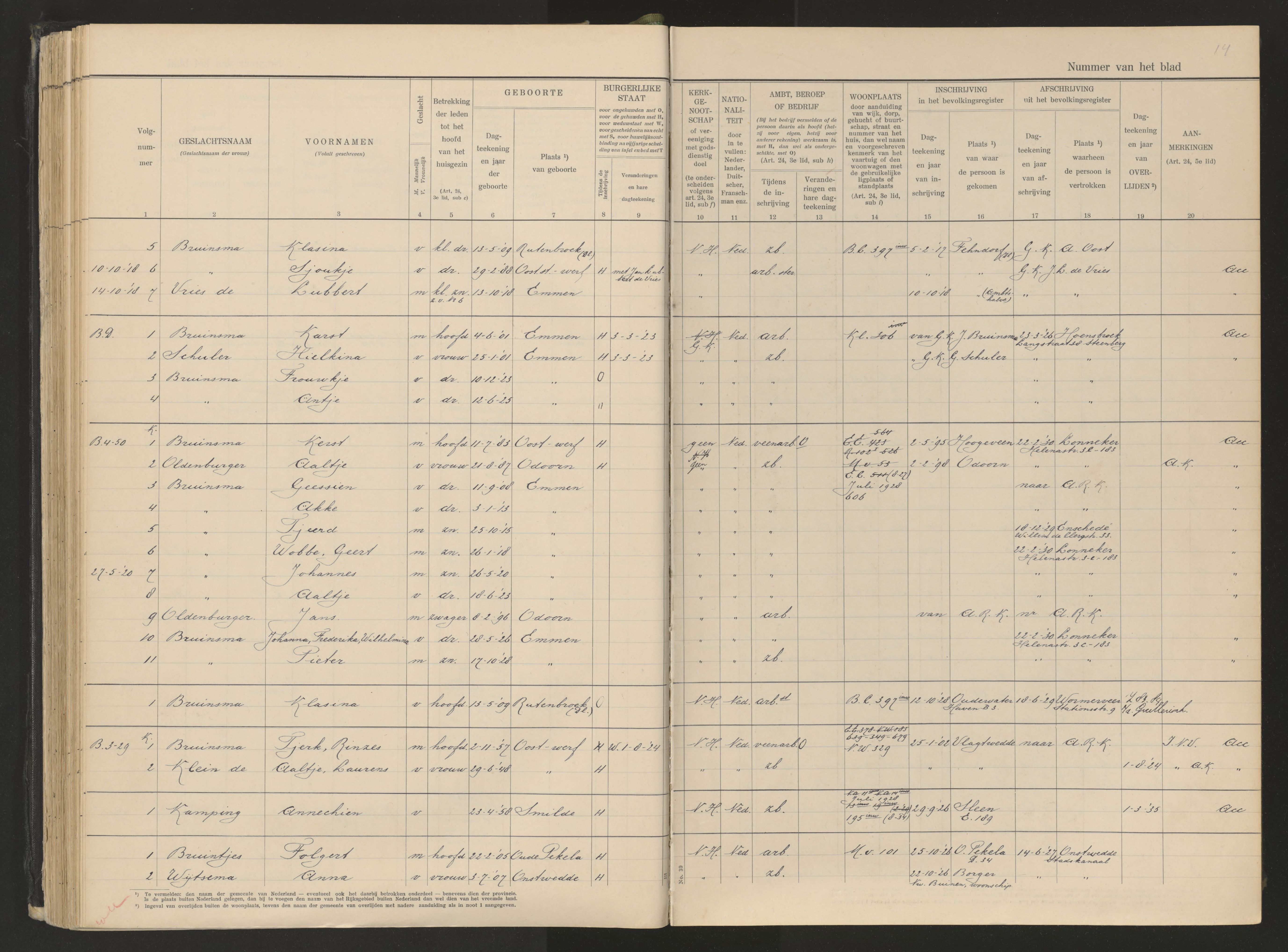 Vertrokken personen Emmen 1926-1936 Bruinsma-Veenstra http://alledrenten.nl/bronnen-bevolkingsregisters https://www.drentsarchief.nl/onderzoeken/genealogie/bladeren-door-bronnen/registers/ gezinskaart 1918-1936 https://www.wiewaswie.nl/nl/detail/14695480Opmerkingen: vader bruidegom overleden