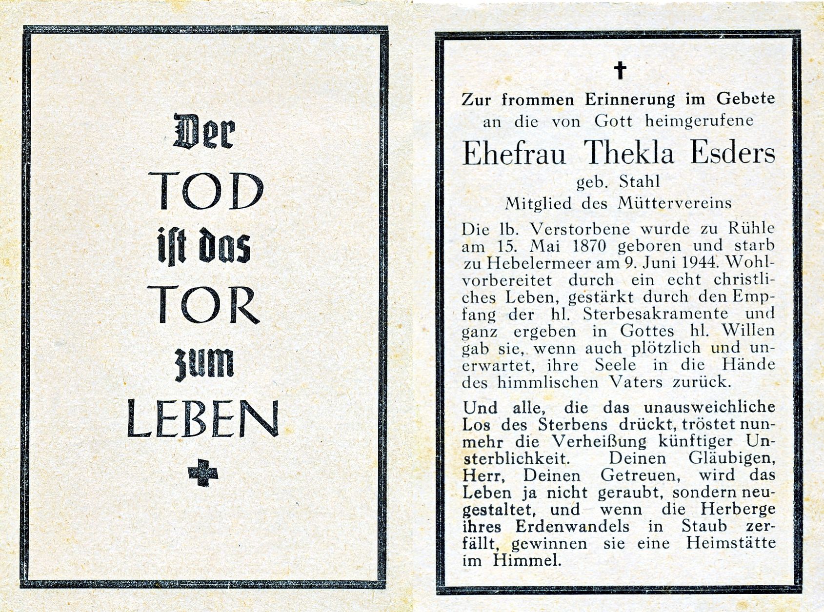 53 2 Esders Johann Gerhard Gastwirt in Hebelermeer 18620924 Hebelermeer Esders Stephan Gastwirt zu Hebelermeer Robben Gesina Esders geboren Stahl Maria Thekla Wittwe in Schöninghsdorf 18700515 Rühle Stahl Bernard Eigener zu Rühle Borker Gesina Hebelermeer 19161107