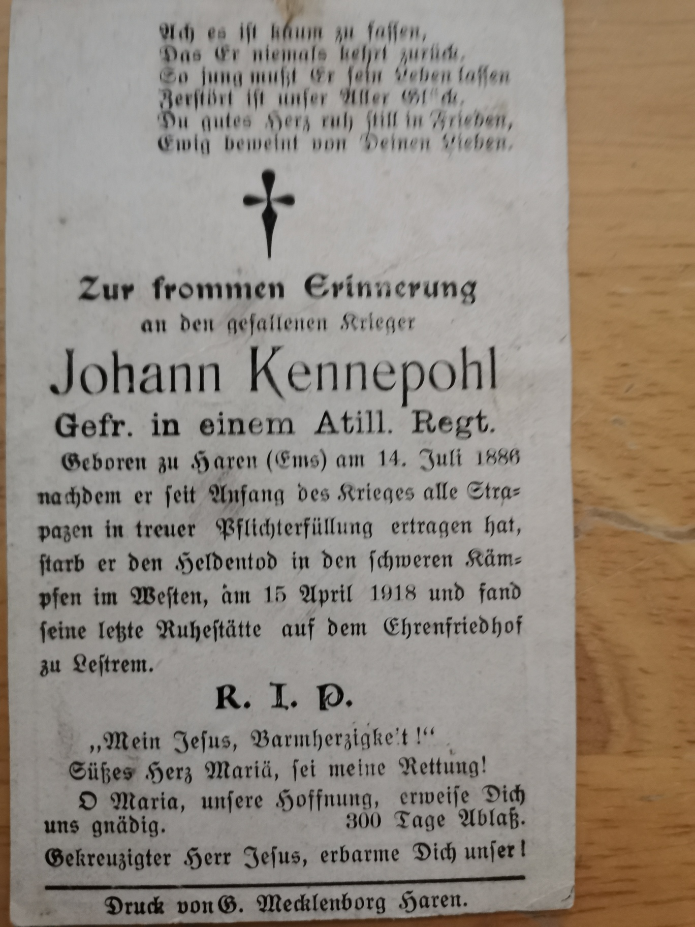 Kennepohl Johann Heinrich 14.07.1886 15.04.1918 Gefreiter Sterf-/vermissingsplaats: Le Rousateux