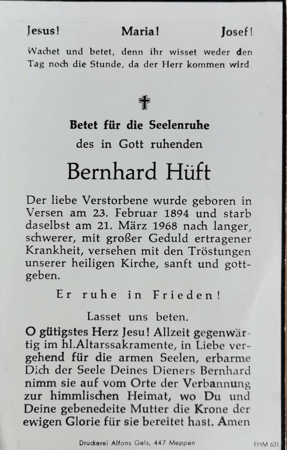 Bernhard Hüft - Hüvet (1894-1968)bidprentje Petra Einspannier1062 24 Hüft Bernard Hermann Haussohn 18940223 Versen Hüft Johann Georg Herbers Maria Elisabeth Eigener zu Versen Brümmer Catharina Haustochter 18970312 Provinzialmoor Brümmer Gerhard Heinrich Husmann Maria Gesina Kolonist im Provinzialmoor Versen 19190916