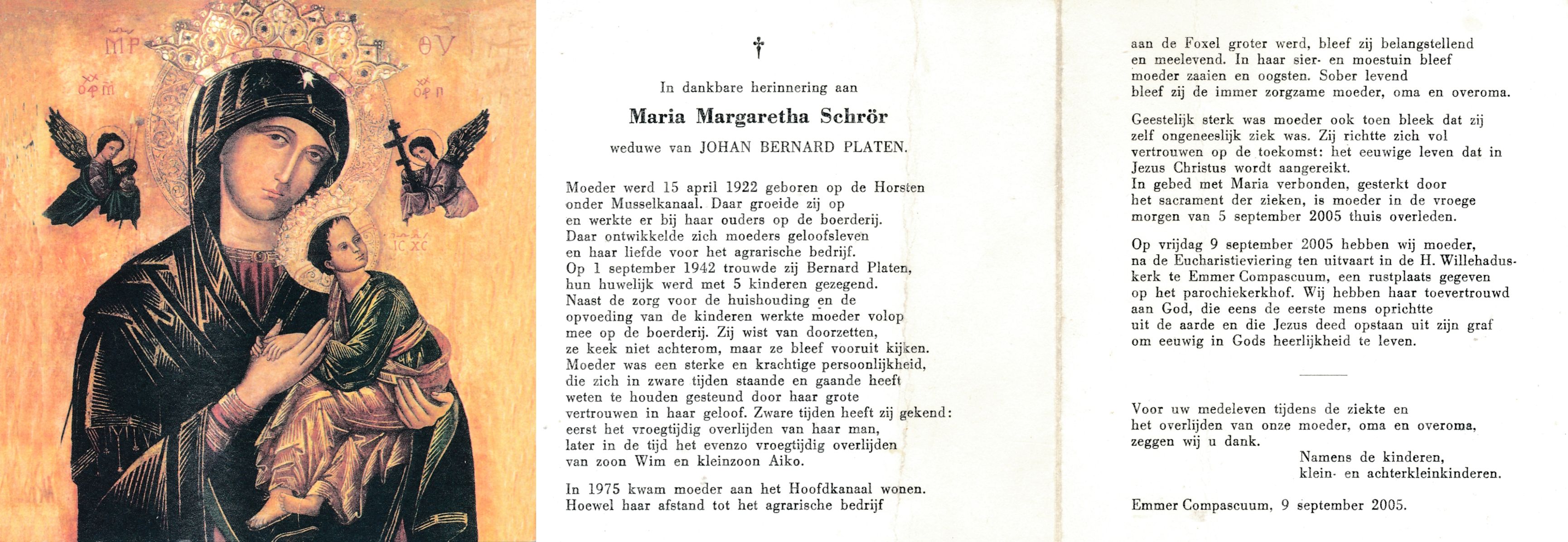 Wilt u bij het overnemen van gegevens uit deze stamboom alstublieft een verwijzing naar de herkomst opnemen: Pauline Berens Wesuwe, "Bevolkingsreconstructie Wesuwe + Nakomelingen + Rechtstreekse Voorouders", database, Genealogie Online (https://www.genealogieonline.nl/ofb-wesuwe/I58865.php : benaderd 9 januari 2026), "Maria Margaretha Schrör (1922-2005)".