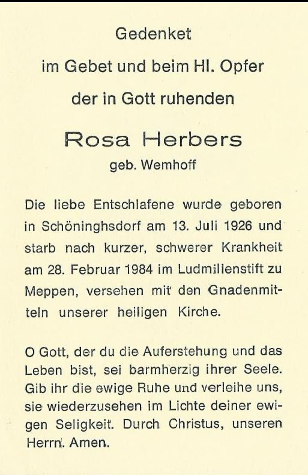 Wilt u bij het overnemen van gegevens uit deze stamboom alstublieft een verwijzing naar de herkomst opnemen: Pauline Berens Wesuwe, "Bevolkingsreconstructie Wesuwe + Nakomelingen + Rechtstreekse Voorouders", database, Genealogie Online (https://www.genealogieonline.nl/ofb-wesuwe/I63335.php : benaderd 20 januari 2026), "Rosa Wemhoff (1926-1984)".
