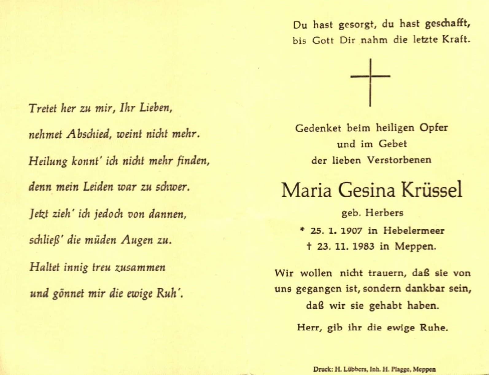Wilt u bij het overnemen van gegevens uit deze stamboom alstublieft een verwijzing naar de herkomst opnemen: Pauline Berens Wesuwe, "Bevolkingsreconstructie Wesuwe + Nakomelingen + Rechtstreekse Voorouders", database, Genealogie Online (https://www.genealogieonline.nl/ofb-wesuwe/I63410.php : benaderd 23 januari 2026), "Maria Gesina - Gesina Herbers (1907-1983)".