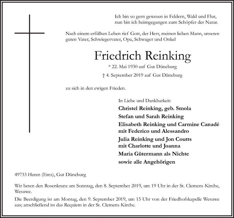 Wilt u bij het overnemen van gegevens uit deze stamboom alstublieft een verwijzing naar de herkomst opnemen: Pauline Berens Wesuwe, "Bevolkingsreconstructie Wesuwe + Nakomelingen + Rechtstreekse Voorouders", database, Genealogie Online (https://www.genealogieonline.nl/ofb-wesuwe/I66536.php : benaderd 18 januari 2026), "Friedrich Reinking (1930-2019)".