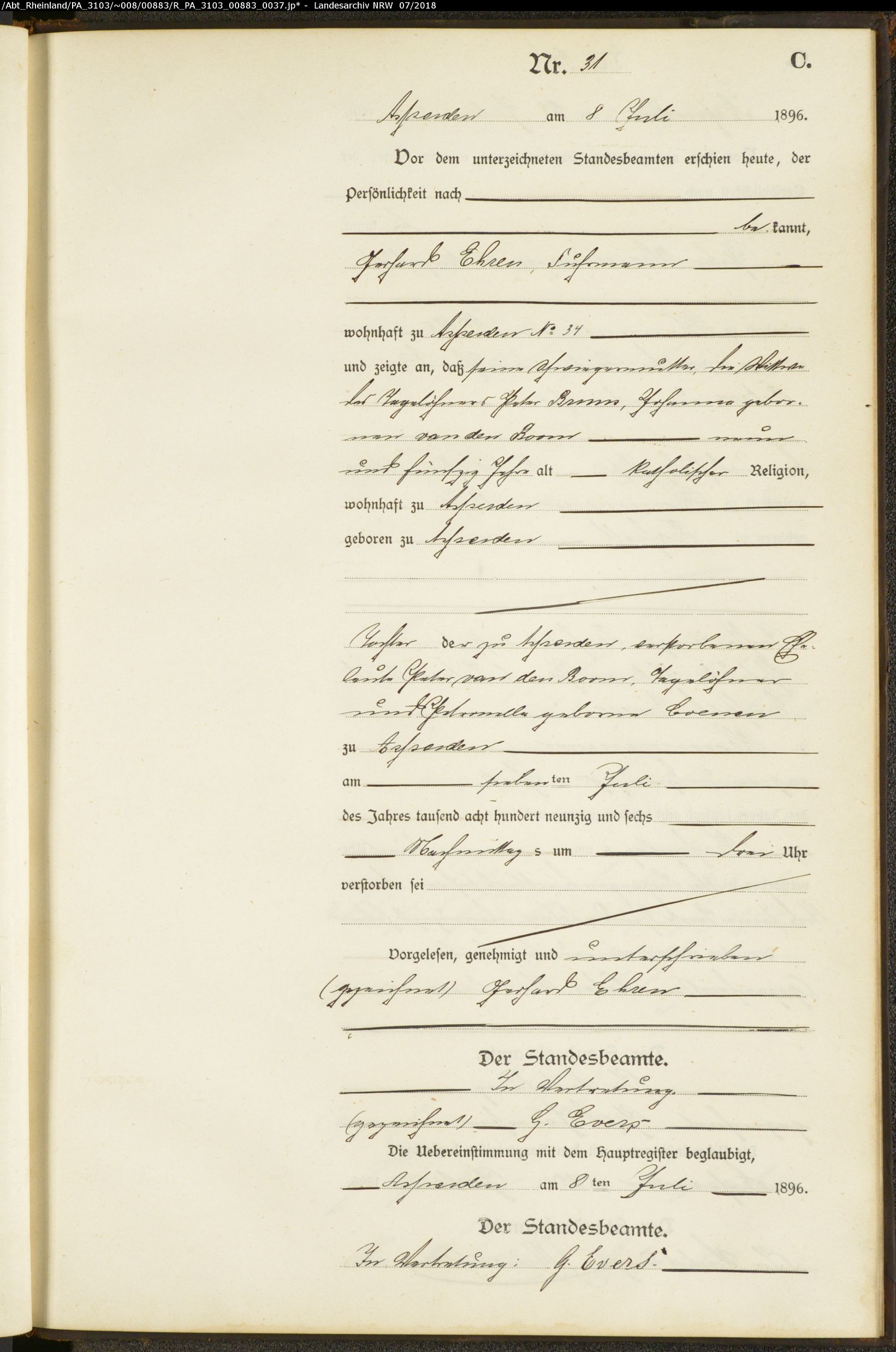 Kirchl. Trauung 29.04.1858 Asperden, Zeugen: Wilhelm Bruns, Maria van den Boom / Er: * 65-1828 Keppeln; + 14.03.1878 in Asperden 11-1878 Asperden / Sie: * 47-1827 Asperden; + 07.07.1896 in Asperden 31-1896 Asperden;