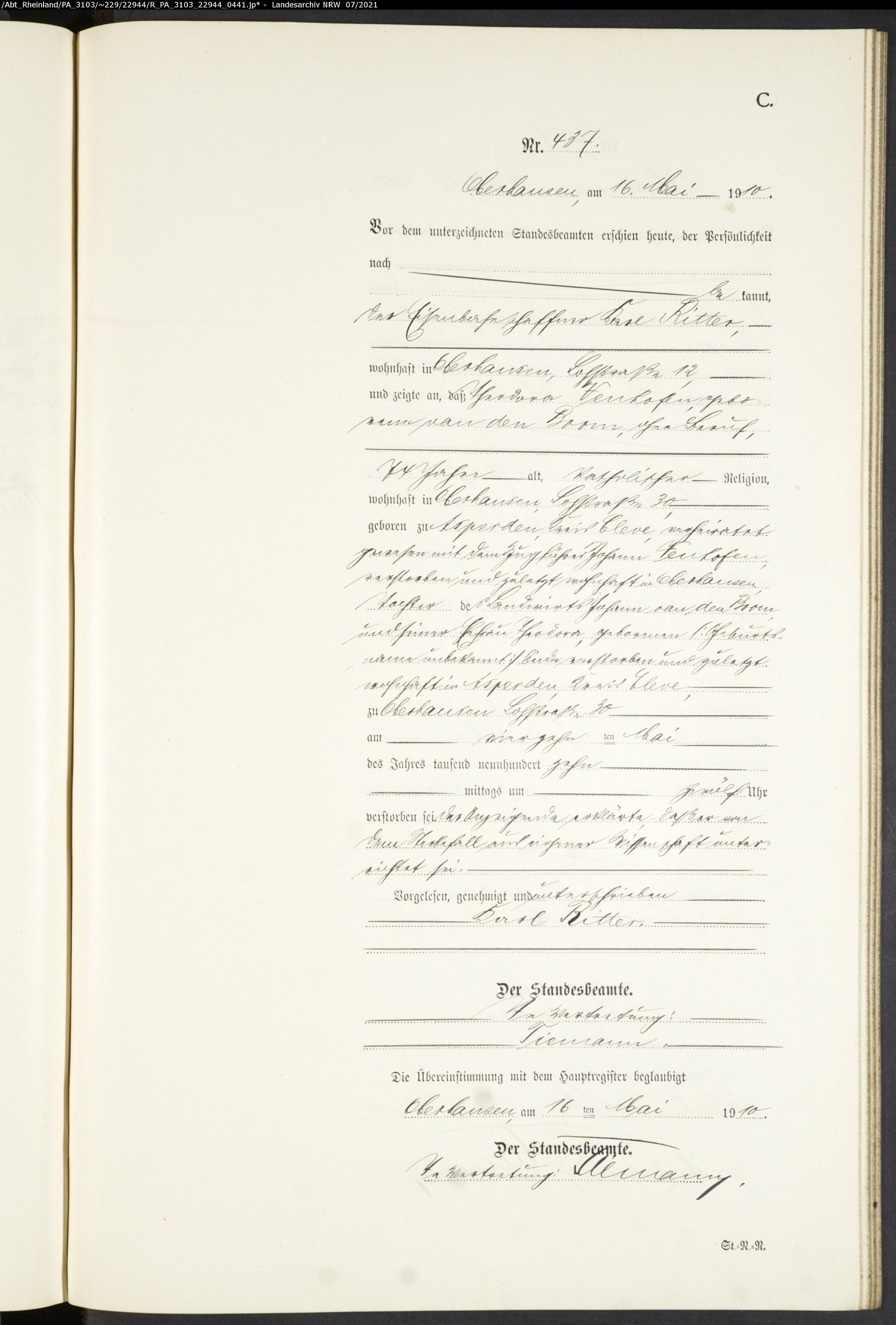 Kirchl. Trauung 19.05.1857 Asperden, Zeugen: Gerhard Venhoven, Maria van den Boom / Er: (Venhofen); * 50-1830 Asperden / Sie: * 59-1835 Asperden;
