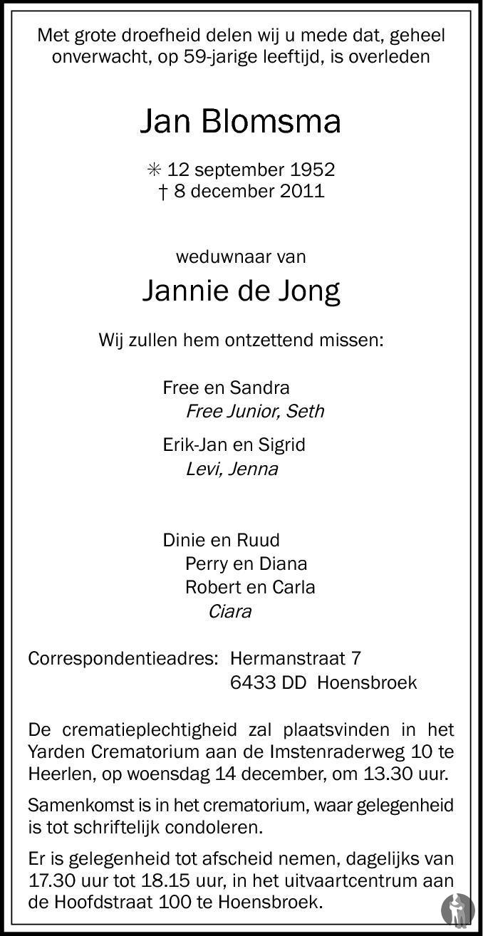 Wilt u bij het overnemen van gegevens uit deze stamboom alstublieft een verwijzing naar de herkomst opnemen: Rolf Kapma, "Stamboom Kapma", database, Genealogie Online (https://www.genealogieonline.nl/stamboom-kapma/I508912.php : benaderd 26 januari 2026), "Jannie de Jong (1956-1986)".